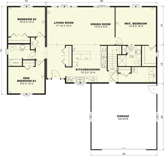 The Shoreview 1568 Dimensions: 28' x 40' / 14' x 32' Square Footage: 1568 Bedrooms: 3 Bath: 2 Back to Rambler Floorplans